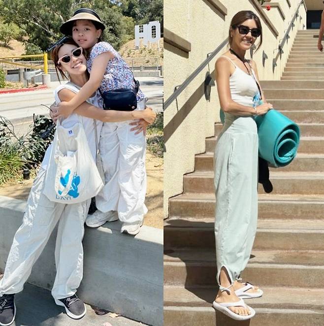 공개한 사진에서 이윤지는 화이트 탱크톱과 민소매 티셔츠에 편안한 팬츠를 착용한 모습을, 이윤지의 딸은 화려한 무늬의 블라우스에 화이트 팬츠를 착용한 여행룩으로 훈훈하면서도 다정한 모녀 스타일을 선보였다.