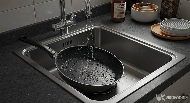 따라서 사용 후에는 최대한 천천히 식도록 싱크대에 5~10분 가량 방치해두는 편이 좋다. 이후 프라이팬이 어느 정도 식으면 미지근한 물로 세척해야 한다.