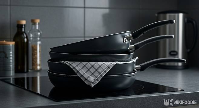이런 일을 방지하려면 팬 사이에 공간을 만들어 서로 코팅을 손상시키지 않게 만들어야 한다. 실리콘 패드나 키친타올을 팬과 팬 사이에 넣어두면 쉽게 공간을 확보할 수 있다.