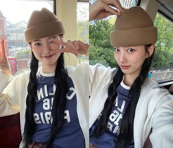 배우 겸 가수 수지가 영국 런던에서 양갈래 머리에 귀여우면서도 보이시한 모자를 쓴 런더너 같은 외출 스타일로 눈길을 사로잡았다.
