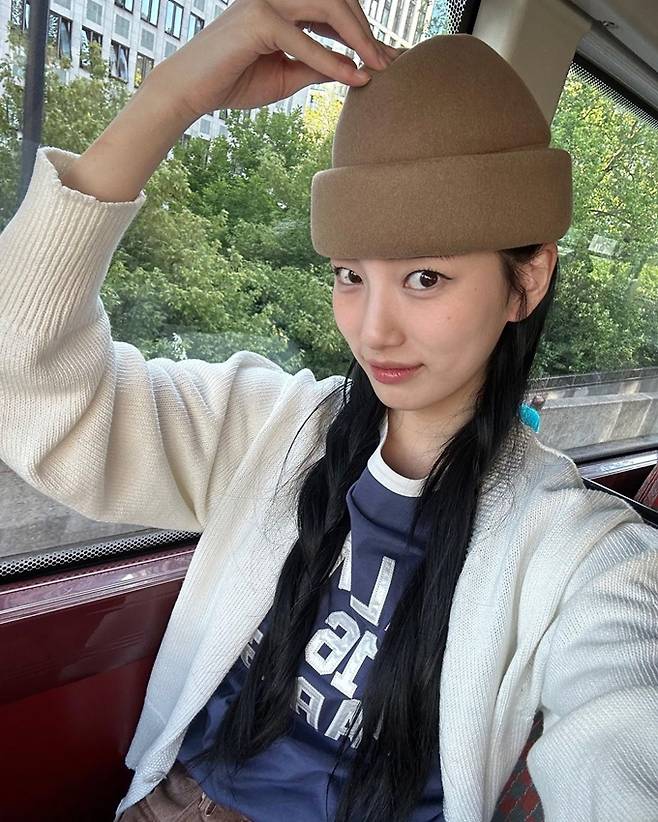 공개한 사진에서 수지는 양갈래 헤어 스타일에 라운드 스타일의 롤업 버킷햇을 쓰고 화이트 니트 카디건을 걸친 귀여우면서도 보이시한 모습으로 런더너가 연상되는 외출룩으로 눈길을 끌었다.