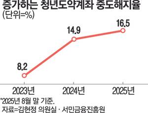 23일 국회 정무위원회 소속 김현정 더불어민주당 의원이 확보한 서민금융진흥원 자료에 따르면 올해 8월 기준 청년도약계좌의 중도 해지율은 16.5%에 달한다. 청년도약계좌에 가입한 230만명 가운데 38만명이 통장을 깼다는 의미다. 중도 해지율은 2023년 8.2%, 2024년 14.9%로 계속 오르고 있다.