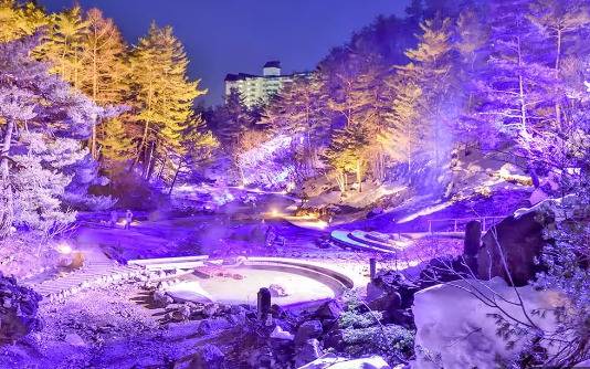 또 구사쓰 온천의 상징인 유바타케 온천수가 계단식 구조로 흘러내리며 증기가 피어오르는 모습이 인상적이며 매일 저녁 유바타케 일루미네이션이 열려 환상적인 겨울 풍경을 감상할 수 있습니다.