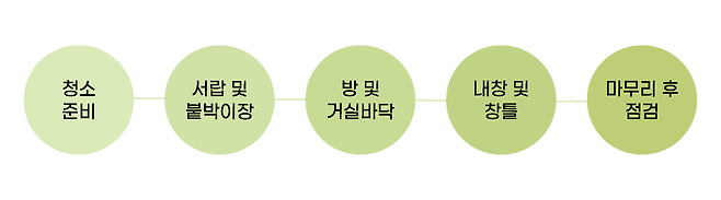 서비스 과정도 [청소 준비 → 서랍 및 붙박이장 → 방 및 거실 바닥 → 내창 및 창틀 → 마무리 후 점검] 순으로 동일하게 진행되어요.