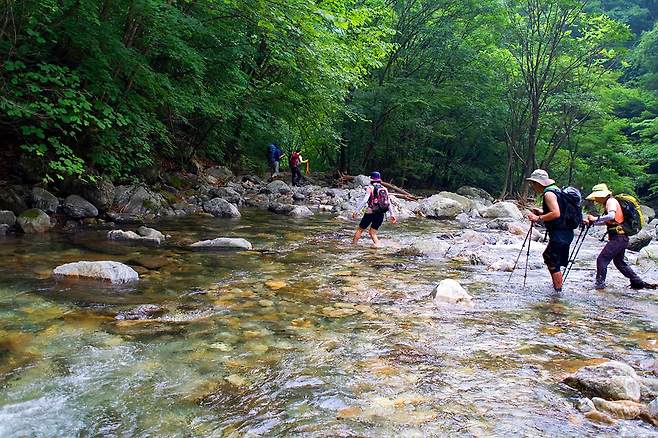 경기 가평군에 위치한 용추계곡은 24km에 이르는 긴 계곡에서 9개의 절경을 자랑합니다. 울창한 숲과 함께 흐르는 맑은 물줄기가 여름의 더위를 식혀줍니다.