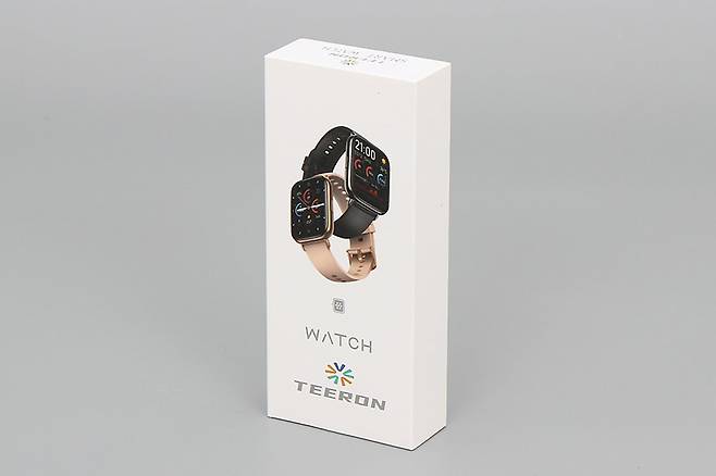 TEERON 스마트 워치는 흰색 바탕 앞면에 제품 이미지를 컬러로 인쇄한 박스 패키지에 담겨있다. 일반적인 아날로그시계의 패키지에 비하면 박스의 크기가 작은 편이다.