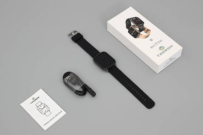 구성품으로는 TEERON 스마트 워치 본체와 충전 케이블, 그리고 사용 설명서로 이루어져 있다.