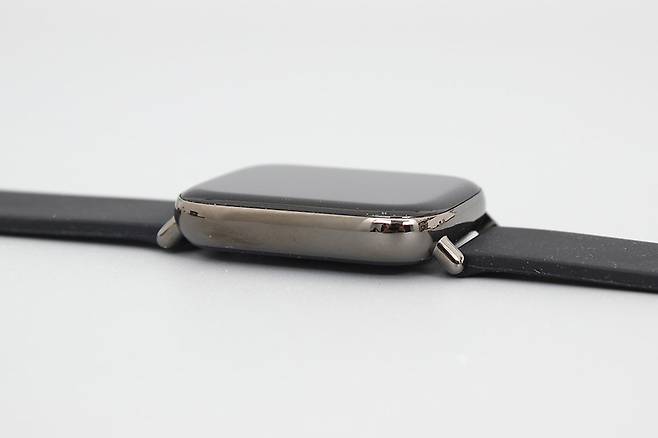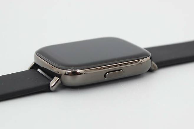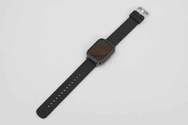 색상은 블랙, 다크 그레이, 로즈 골드 등이 있는데, 오늘은 블랙 모델로 리뷰를 진행할 예정이다. 시계의 기본적인 형태는 사각으로, 우레탄 밴드도 검은색을 사용하고 있다.