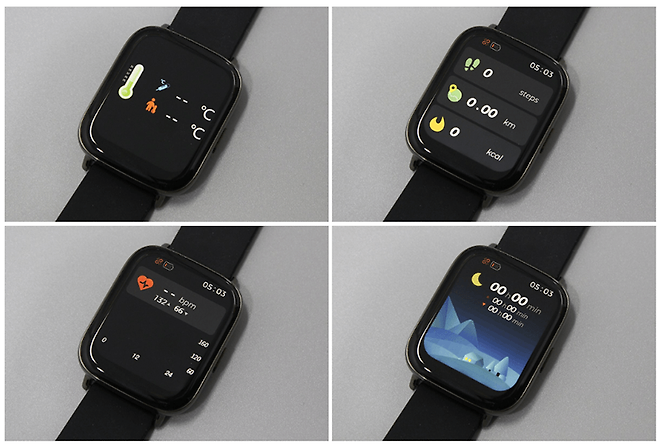 기본 화면에서 스크린을 화면 왼쪽으로 스와이프하면 체온 측정 메뉴가 표시되며, 걸음 수와 이동 거리, 소비 열량이 표시되는 상태 화면과 심박수 측정 화면, 수면 정보, 날씨 정보도 확인 가능하다.