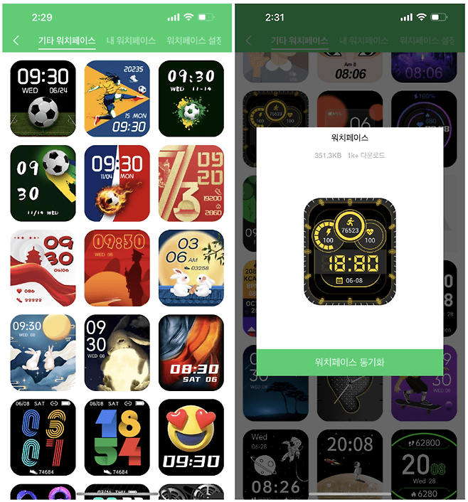 스마트폰 앱을 이용하면 더 다양한 워치 페이스를 사용할 수 있다. 앱의 기본 화면 하단에서 기기 메뉴를 선택한 후 워치페이스 설정 화면에 들어가면 기타 워치페이스 메뉴에 기본 워치 페이스를 제외한 다양한 종류가 제공되는데, 이 중에서 원하는 워치 페이스를 선택한 후 워치페이스 동기화를 선택하면 TEERON 스마트 워치로 해당 워치 페이스가 전송되고 자동 설정된다.
