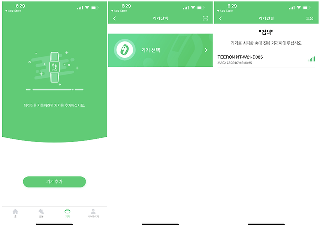 스마트폰 앱에는 TEERON 스마트 워치가 측정한 다양한 신체 정보가 저장된다. 메인 화면에는 앱 설치 시 설정한 걷기 목표와 실제 걸음 수, 이동 거리, 소비 칼로리가 표시되며, 그 아래로 수면 정보와 심박수, 혈압, 체온, 산소포화도를 확인할 수 있다.