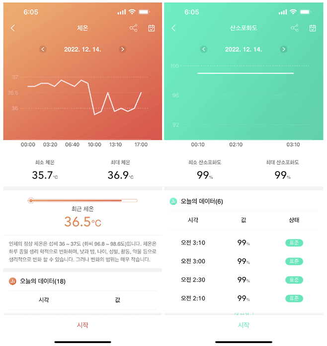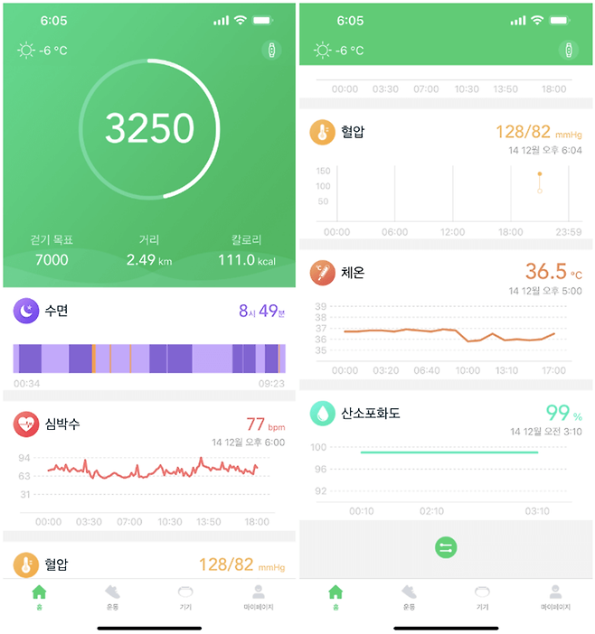 수면 정보와 심박수, 혈압, 체온, 산소포화도는 각 항목에 들어가서 좀 더 자세한 정보를 확인할 수 있다.