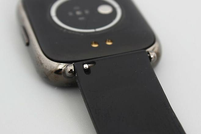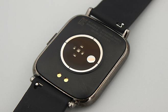 TEERON 스마트 워치 뒷면 센서 아래에 있는 두 개의 원형 접점은 충전 단자로, 마그네틱 방식을 사용해 충전 케이블을 가까이 대면 저절로 정확한 위치에 부착된다.
