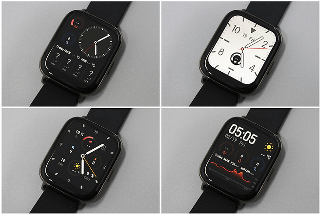 기본적인 워치 페이스는 아날로그시계에 심박수와 걸음 수, 날씨 등이 한 화면에 나타나는 형태이며, 이외에도 세 가지의 워치 페이스를 추가로 선택해 사용할 수 있다.