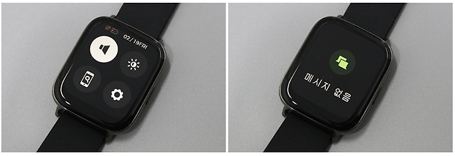 기본 화면에서 디스플레이를 아래로 스와이프하면 기능 인터페이스 설정 화면이 나타나는데, 여기서는 소리와 화면 밝기, 워치 위치 찾기, 상세 설정 메뉴를 선택할 수 있다. 기본 화면에서 디스플레이를 위로 스와이프했을 때는 도착한 메시지를 확인할 수 있다.