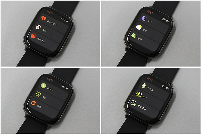 기본 메뉴에서 디스플레이를 오른쪽으로 스와이핑하면 다양한 메뉴가 나타나는데, 체온과 훈련, 상태, 심박수 측정, 혈압, 혈중산소, 수면정보, 날씨 등을 확인할 수 있다.