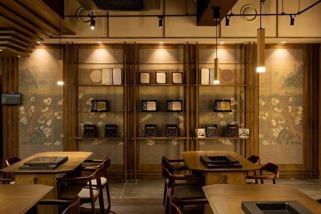 이 곳의 매장 외관은 웅장하고 고급스러우며, 고풍스러운 분위기가 인상적입니다. 입구에는 우드 현판 간판과 조명이 설치되어 있어 고급스러움을 한층 더해줍니다.