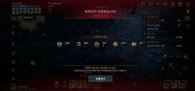 A. 로드나인은 보스 트라이 등으로 사망할 경우 경험치 대신 ‘스탯’이 하락하는 시스템을 가지고 있다. 하락한 ‘스탯’은 당연히 전투력에도 영향을 미치니, 좌측 골드 UI 하단 십자가 모양을 눌러 즉시 복구하자. 하루에 5번은 무료다.