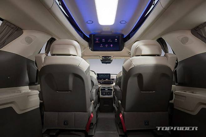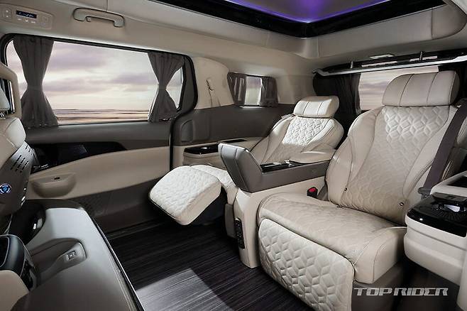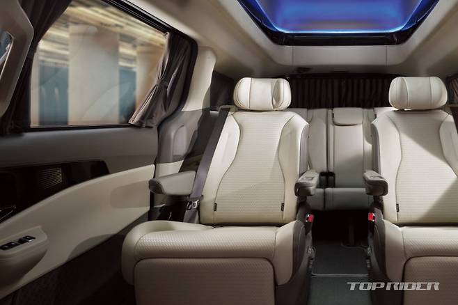 또한 UV-C 살균 암레스트 수납함, 에어컨 광촉매 살균 시스템, 향균 처리 고성능 콤비 필터, 서라운드 뷰 모니터, 후측방 모니터, 리모트 360도 뷰 등도 적용됐다. 모두 기존 9인승 시그니처부터 제공됐던 옵션이다. 시그니처부터는 디지털키 2, 터치타입 외부 도어핸들을 지원한다.