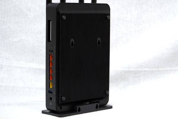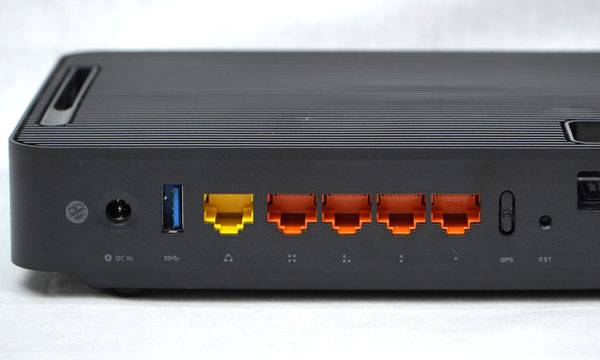 AX6000M 후면 연결 단자를 살펴보면 외부 전원 어댑터 단자(DC IN)를 비롯해 USB 3.0 포트, 1개의 WAN 포트와 4개의 LAN 포트, WPS 버튼과 리셋 홀로 구성되어 있다. 기가비트급 하드웨어 NAT 가속기를 내장하여 LAN-to-LAN 및 LAN-to-WAN 통신을 양방향 2000Mbps(2Gbps) 속도로 처리할 수 있어 무선과 빠르고 유선 100Mbps에 머물고 있는 저가형 제품들과 달리 인터넷 서비스 업체들의 기가 인터넷 상품을 쓸 수 있으며, 유선 기가비트 네트워크 구성도 가능하다.