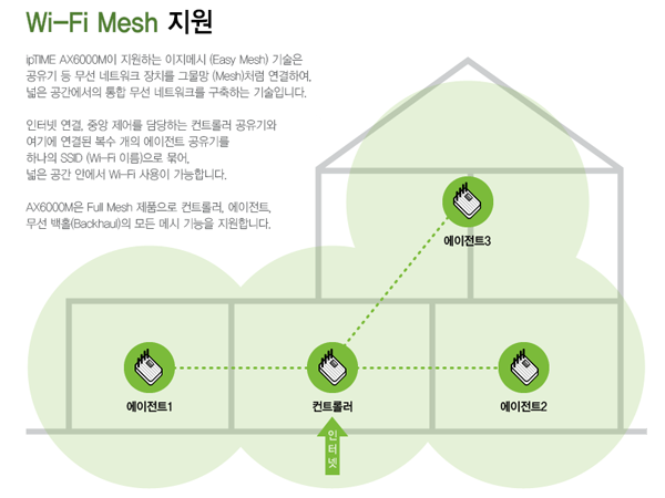 이지 메시(Easy Mesh) 기술을 지원하는 AX6000M은 인터넷과 직접 연결되어 중앙 제어를 담당하는 컨트롤러 공유기와 여기에 연결된 에이전트 공유기를 하나의 SSID로 묶어 넓은 공간에서 통합 무선 네트워크를 구축할 수 있다. AX6000M은 풀 메시 제품으로 컨트롤러와 에이전트, 무선 백홀의 모든 메시 기능을 지원한다.