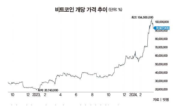 최근 1억 원을 돌파했던 비트코인이 변동성을 보이고 있는데."과거 투자자들은 비트코인을 투기적 자산으로 여기고 단기투자하는 경우가 대부분이었다. 또한 비트코인 가격이 오르면 경제학자나 IB 최고경영자(CEO) 등이 비트코인을 폄하해 가격 하락을 이끌었다. 투자 회사끼리 가격을 올리고 내리는 시세조종도 가능했다. 작전이 가능했다는 얘기다. 하지만 현재 비트코인 시가총액은 1000조 원이 넘어 작전이 불가능하다. 무엇보다 미국 증권거래위원회(SEC)가 현물 ETF(상장지수펀드)를 승인하면서 비트코인이 주류가 돼 작전이 불가능하다. 따라서 과거만큼 급등락 폭이 크지 않을 것으로 전망된다."