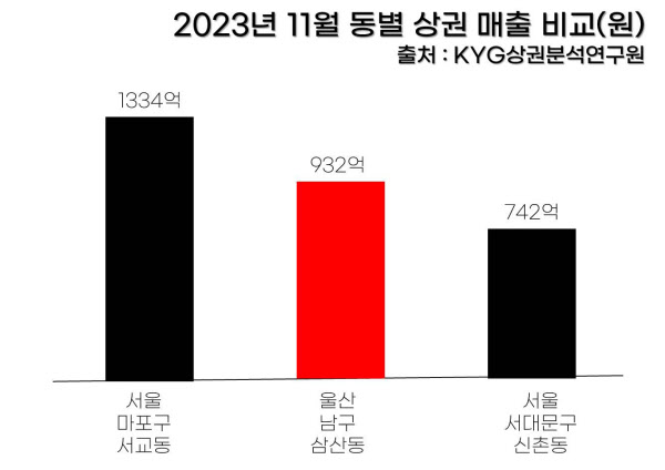 삼산동 상권 전체 매출은 작년 11월 기준 932억원인데요. 서울 신촌동이 742억원이었는데 이보다 200억원 정도 많고 서교동(1334억)보다는 400억원 정도 낮은 수준입니다
