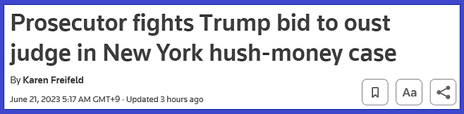 위 기사를 살펴보면 도널드 트럼프 전 미국 대통령은 2016년 포르노 스타 스토미 대니얼스에게 지급한 입막음 비용을 숨기기 위해 사업 기록을 위조한 혐의로 고발을 당한 적 있어. 트럼프 전 대통령은 이 사건을 담당한 판사가 편향되고 민주당과의 연결고리가 있다는 이유로 법관기피를 신청했어.