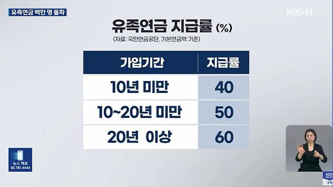 현행법상 유족연금은 기본연금액에 부양가족연금액을 합쳐 지급하고 있으며 국민연금 가입 기간이 10년 미만이었다면 40%의 기본연금액에 부양가족연금액을 더한 액수를 예상하면 된다.