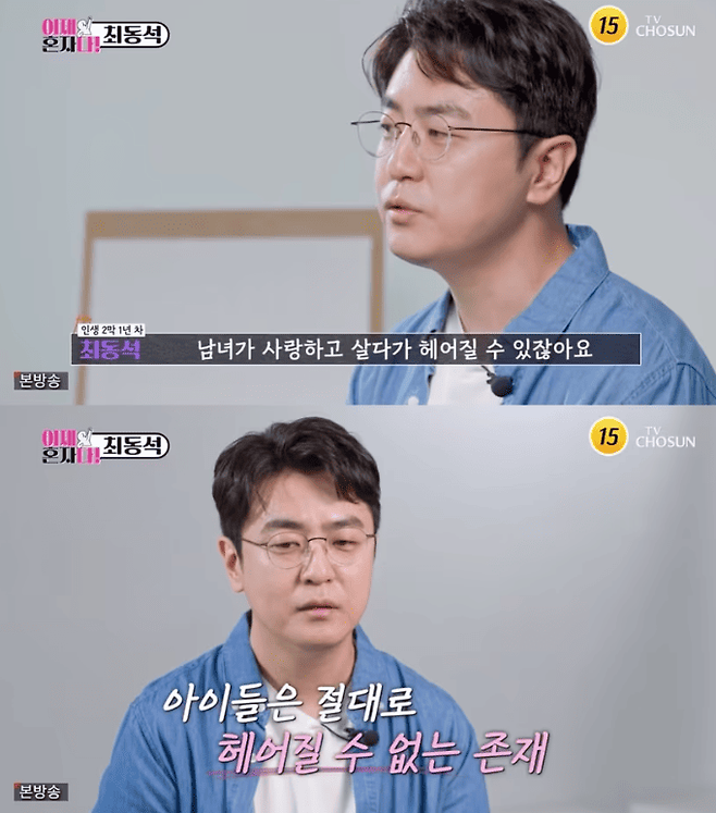 해당 방송에서 최동석은 이혼을 언급하며 "솔직히 말씀드리면 제가 결정한 건 없다, 기사를 보고 알았다"며 "어느 날 외출했다가 돌아왔는데 가족이 집에 안들어왔다. 아이를 찾으러 서울에 왔는데, 기자에게 전화가 왔다. 이혼 기사가 나왔는데 알고 계시냐고 하더라. 그래서 알게 됐다"고 당시 상황을 털어놔 세간의 관심을 끈 바 있습니다.