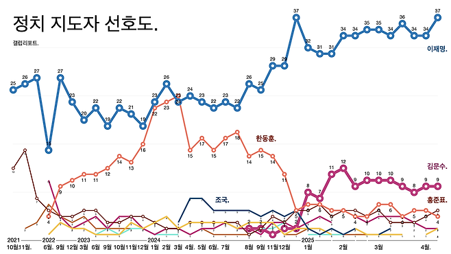 - 이재명 지지율은 37%까지 올랐다. 지난해 12월 탄핵소추안 가결 직후 역대 최고 지지율과 동률이다.