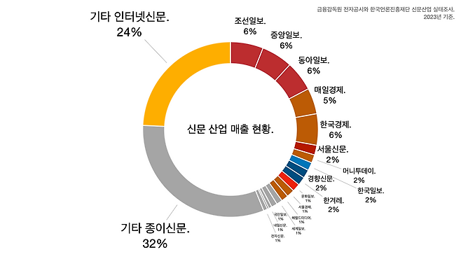 - 전체 신문 산업을 보면 종이신문과 인터넷신문을 합쳐 5조 원 규모 시장이다. 조중동의 파이가 커보이긴 하지만 전체 시장을 놓고 보면 전체 매출의 18% 정도를 차지한다.