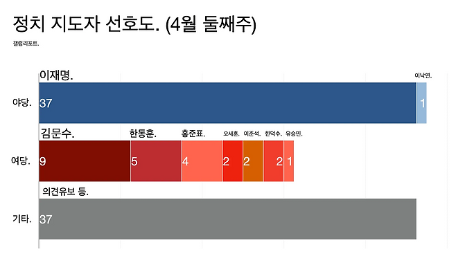 - 국민의힘 후보들은 다 모아도 25%다. 김문수가 9%, 홍준표가 5%다.