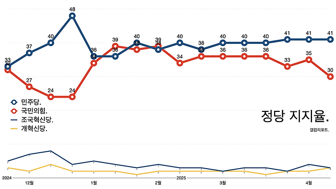 - 민주당 지지율은 41%를 유지하고 있지만 국민의힘 지지율은 30%로 뚝 떨어졌다. 윤석열 파면 이후 첫번째 갤럽 여론조사 결과다.