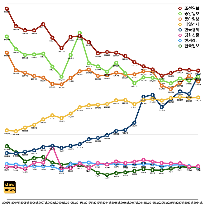 - 동아일보와 한겨레는 각각 -4.5%와 -1.9% 역성장했다.