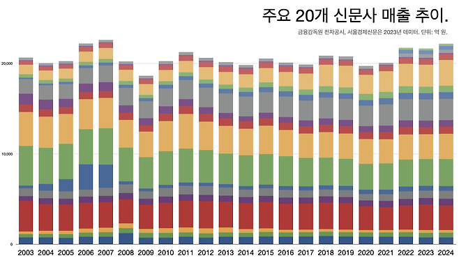 - 상위 18개 언론사 매출은 코로나 팬데믹 첫해인 2020년 2조 원 밑으로 떨어졌다가 4년 연속 2조 원대를 기록하고 있다.