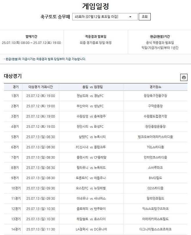 다음 회차인 축구토토 승무패 45회차는 오는 7월 10일(목) 오전 8시에 발매를 개시해, 12일(토) 오후 7시까지 구매할 수 있다. 해당 회차는 국내 프로축구(K리그) 및 미국 메이저리그사커(MLS) 경기를 포함해 총 14경기를 대상으로 한다.