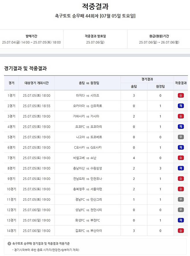 서울올림픽기념국민체육진흥공단(이사장 하형주)이 발행하는 체육진흥투표권 스포츠토토의 수탁사업자 한국스포츠레저가 공식 인터넷 발매 사이트 베트맨을 통해 지난 7월 5일(토)부터 6일(일)까지 진행된 국내 프로축구(K리그) 및 일본 프로축구(J리그) 14경기를 대상으로 한 축구토토 승무패 44회차의 적중 결과를 발표했다.