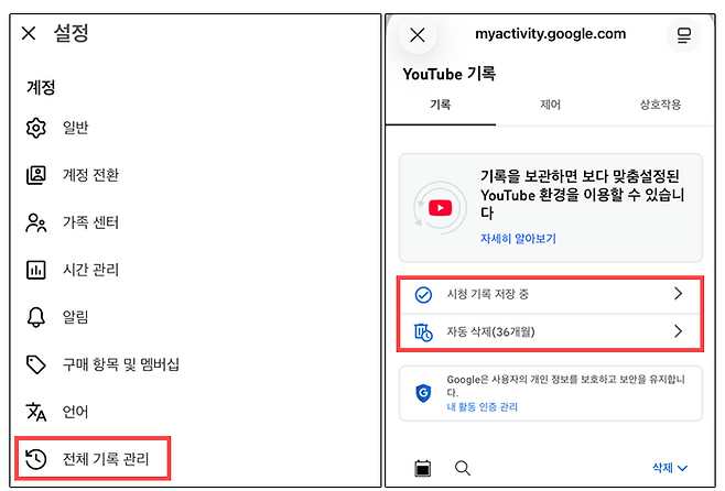 또한, '시청 기록 저장' 항목 아래에 있는 '자동 삭제' 기준을 3개월로 하고 있어도 리캡 조건을 충족할 수 없다. 내년 유튜브 리캡을 보고 싶다면 자동 삭제를 끄거나 18개월 이상으로 바꾸도록 하자.