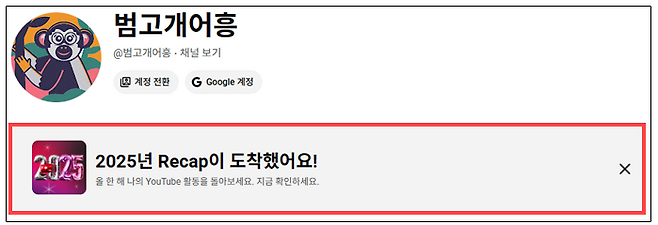모바일 앱에서는 유튜브 앱에서 자신의 계정으로 로그인 한 다음 최하단에 있는 '내 페이지' 아이콘을 눌러보자. 그럼 페이지 상단에 '2025년 Recap이 도착했어요!'라는 팝업을 발견할 수 있다.