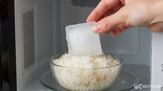전자레인지에 밥을 데우기 전에 밥 위에 얼음 한 조각을 올리고 전자레인지로 돌리면 된다.