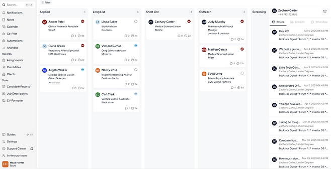 AI는 링크드인, 이메일, 왓츠앱을 통해 홍보 캠페인을 자동으로 전개하며, 간편하게 면접 일정까지 조율한다.