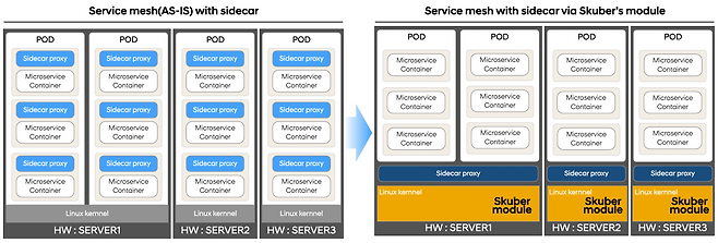 ‘당연함’을 벗어나는데 방점을 뒀다. “검증된 기술을 활용하는 대신 누구도 걷지 않은 어려운 길을 택했습니다. 그게 경쟁력이니까요. 효율적인 아키텍처(구조)를 통해 클라우드에 수반되는 리소스의 무게를 줄였어요. 소프트웨어의 핵심 로직을 담당하는 부분을 ‘서비스 컨테이너’라고 하는데요. 보통 하나의 서비스 컨테이너에 하나의 사이드카 프록시를 붙여 해당 컨테이너의 트래픽과 보안정책을 관할합니다. 이런 서비스 컨테이너와 사이드카 프록시의 조합이 ‘서버’고요. 컨테이너 하나당 하나의 프록시가 필요한 구조는 무거워질 수밖에 없는데요. 저희는 한 서버당 하나의 사이드카 프록시로 여러 개의 서비스 컨테이너를 운영이 가능하게 커널(Kernel)이라는 기술을 구축했습니다.”
