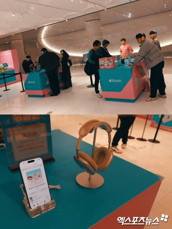 'Apple Music 청음존’도 운영한다. 방문객은 엔젤디의 플레이리스트를 감상할 수 있으며, 6개월 무료 이용권 럭키 드로우에도 참여할 수 있다.