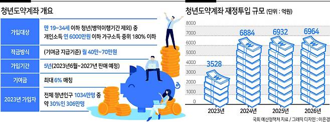 청년도약계좌는 소득이 있는 사람만 가입시킬 경우 매년 7000억원의 예산이 들어간다. 금융위가 국회에 낸 청년도약계좌 예산안에 따르면, 내년 예산은 3527억7200만원이다. 금융위는 내년 가입자를 만 19~34세 인구 1034만명 중 소득 기준을 만족하는 306만명으로 보고 예산을 짰다. 올해 3월 시행된 청년희망적금을 참고삼아 월 납입한도 40만~70만원의 80%를 납입할 것이라 예상하고, 정부 기여금 월 최대 2만3400원을 6개월(내년 운영기간)간 준다고 계산한 것(306만명 X 80% X 2.34만원 X 6개월)이다. 12개월간 납입이 되는 2024년부터는 연간 예산이 두배로 뛰어 7000억원에 육박하고, 2026년까지만 약 2조4300억원이 들 것으로 전망된다.