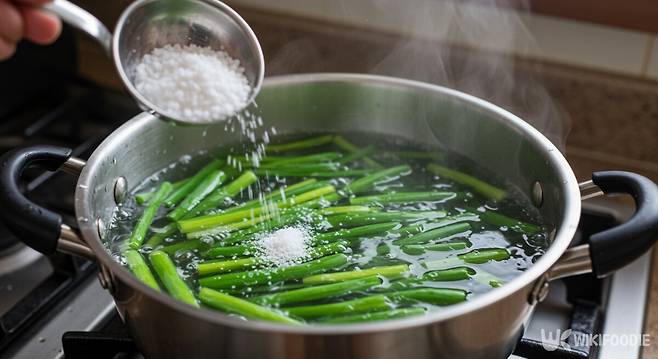물을 끓이고 소금을 약간 넣는다. 부추를 넣고 10초 이내로 데친다. 오래 익히면 향과 색이 모두 빠지기 때문에 짧게 데치는 것이 중요하다. 끓는 물에 들어간 직후 색이 진해지면 바로 꺼낸다. 찬물에 헹궈 잔열을 제거하고, 손으로 물기를 꾹 짜낸다.