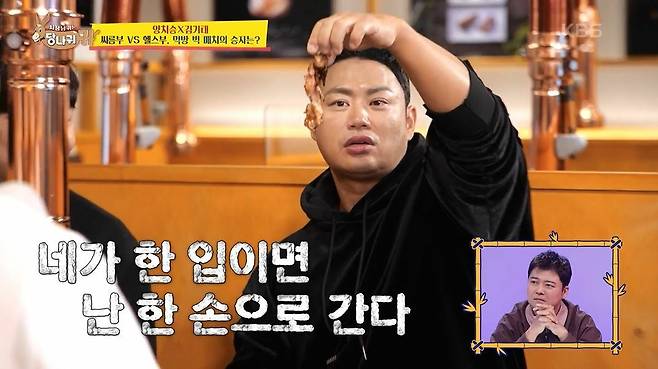 하지만 양치승은 끝까지 맨손으로 닭갈비를 한입 가득 베어 물었다. 함께 식사하던 네 사람은 양치승의 모습을 보고 전원이 맨손으로 고기 파도타기를 하기도 했다. 이를 본 허재는 “비스킷인 줄 알았다”고 말해 웃음을 자아냈다. 씨름선수 출신 2명과 헬스 트레이너 2인은 총 17인분을 먹으면서 엄청난 식성을 선보였다.