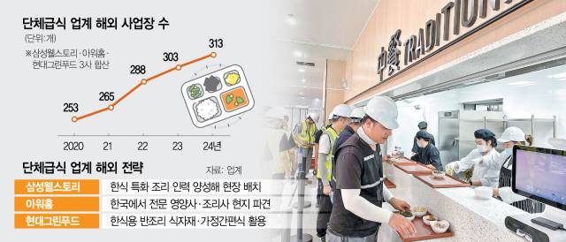19일 식품업계에 따르면 아워홈·현대그린푸드·삼성웰스토리 3사가 해외에서 운영 중인 단체급식 사업장 수는 지난해 말 기준 313개를 기록해 2020년 대비 23.7% 늘었다. 주로 한국 기업을 대상으로 이뤄진 해외 사업 초창기와 달리 최근 들어서는 현지 기업의 러브콜도 이어지는 추세다. 아워홈의 베트남 단체급식 점포 중 현지 기업을 대상으로 한 사업장의 비율은 지난해 말 기준 53%까지 증가했다. 삼성웰스토리는 해외 급식 사업장 중 현지 업체를 포함한 그룹사 외부 기업의 비율이 최근 80%를 기록할 정도로 높아졌다.