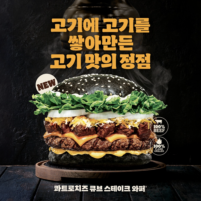 고소한 콰트로치즈 & 블랙번 조합에 100% 소고기 패티, 풍성한 큐브 스테이크를 더해 씹는 맛 제대로 살린 버거킹 신상 와퍼! 지금 바로 버거킹에서 만나볼 수 있다고 하니 진한 고기 맛이 당긴다면 잊지 말고 살펴보길.