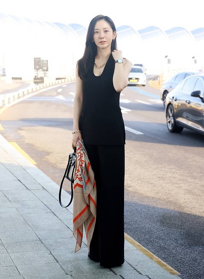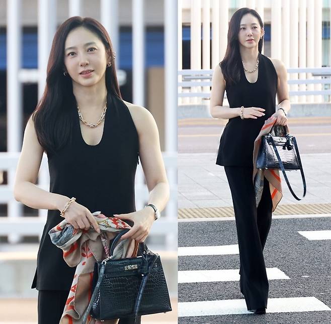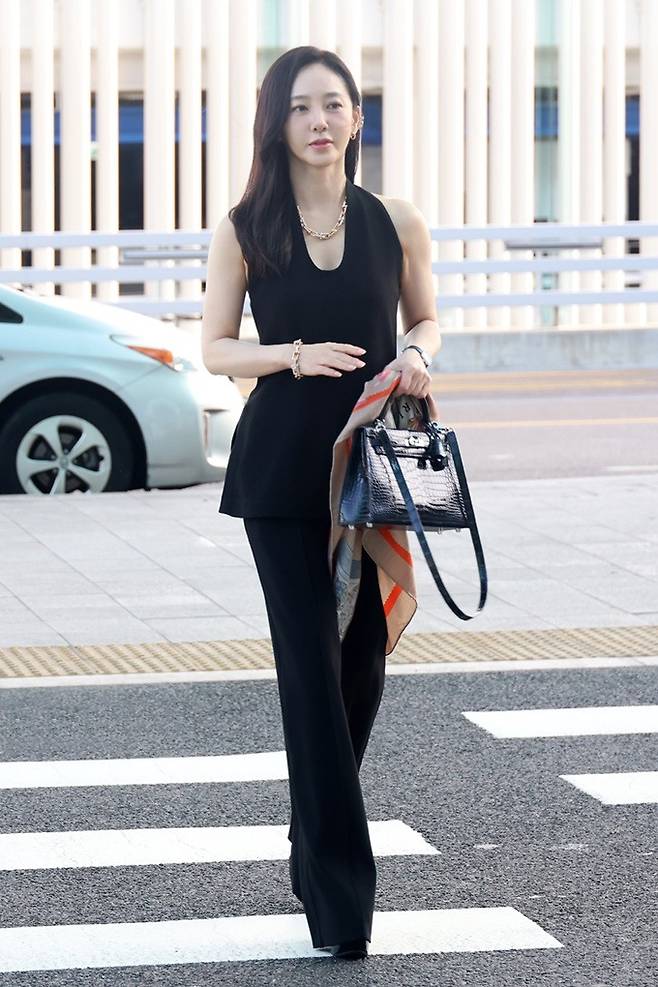 배우 박주미가 시크한 테일러드 섬머 슈트룩으로 세련된 공항패션을 연출했다.